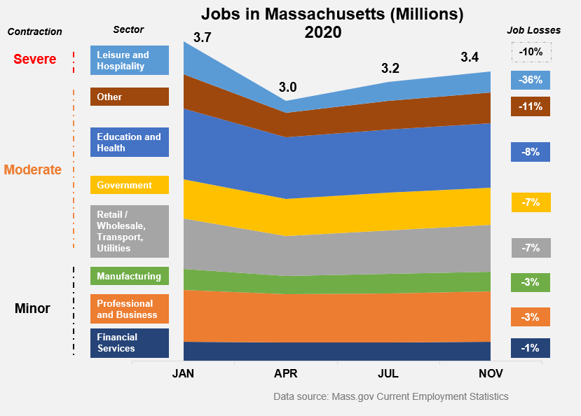 The year 2020 was an ugly one for the economy, and April was particularly horrific. The unemployment rate jumped six-fold from 2.8% to 16.2% as layoffs spread rapidly across the state. Spring brought promise and healing, however. The weather warmed, the virus retreated and Governor Charlie Baker initiated his four-phase reopening plan in May. From May through September, Massachusetts added an average of 64,000 jobs per month. Unfortunately, the recovery is not over. Fall and winter have coincided with a spike in infections, the pace of hiring has slowed, and the degree of economic hardship varies widely across walks of life.